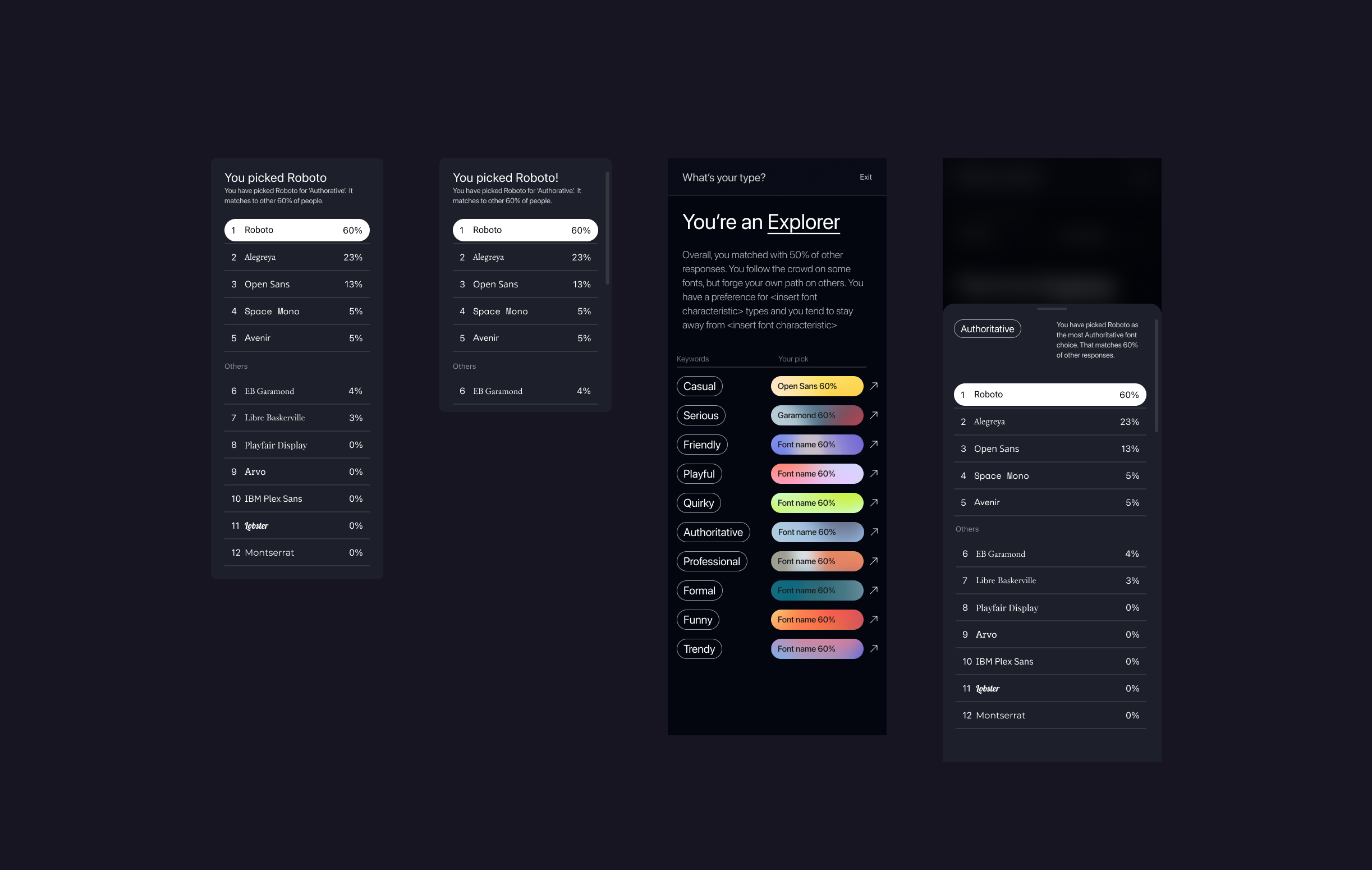 I was a part of the team that designed this survey in 2022, while a member of the Computational Creativity Lab at Carnegie Mellon University, the survey asks users to pick the font that best matches an emotive adjective—such as “playful,” “informative,” and “trendy.” By gathering user responses, What’s Your Type crowdsources a database of font preferences, searchable by language and nationality of the respondent. Our hope was to launch this survey and use the data to examine how associations differ across geography, language, and eventually other demographic characteristics.